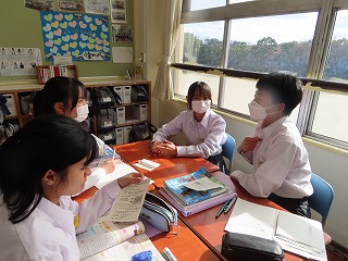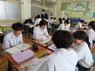 ③班の中の一人一人のいけんや考えを聴き合い、そして班でもう一度、学びの探求に入ります。➡