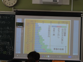 個人の意見や考えから、班の中で学び合った根拠を持った意見や考えを班ごとに発表をしてもらいました。キーワードは「検見法(けんみほう)」と「定免法(じょうめんほう)」です。子どもたちは、『定免法は豊作のときは年貢が1/3しかとられないからいいように思うけど、凶作のときには年貢が半分もとられてしまう。大名にはよい制度化もしれないけど、農民にはよくない。』という意見や、米が足りなくて、『長期的に見たら生活が不安定、だから百姓一揆などがおこった』。中には、班で意見交流をしたけど『なんとなく人々の暮らしは他楽になったと思うイメージは「できるけど根拠をもって説明ができなかった』という意見もあったり・・・。徳川吉宗は享保の改革によって、財政を赤字から黒字に立て直した理由をクラスみんなで考えまとめていきました。