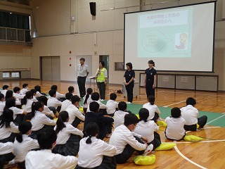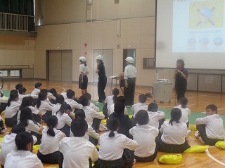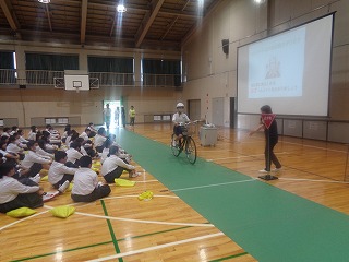 今日の6時間目に、1年生は、四日市市役所道路管理課の方にお越しいただき、交通安全教室を実施しました。安全な自転車の乗り方について学びました。