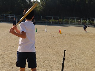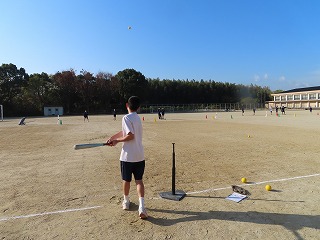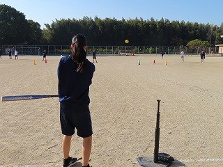 そこで、「バッティングティー」を各班ごとに用意し、T上に置いたソフトボールを巧みなバット操作で鋭い打球や、守備位置の頭上を越えるような、または、目指すポイントに向けて撃てるような技術向上を目指します。そして、仲間と声をかけあいながら、バットでボールを強く捉えることを楽しみながらみんなで協力しながら授業がすすんでいきます。子どもたちの表情はみんな笑顔です。