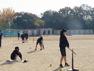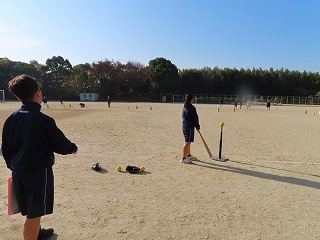 本日12月2日(火)の1限目の授業は、グラウンドでの「(球技)ソフトボール」の授業です。大池中学校では2年生でソフトボール授業に取り組んでいます(3年生でも継続して取り組むことを予定している)。中学校体育授業において、『球技』は様々なボールを活用した授業実践をしています。「ゴール型」、「ネット型」そして「ベースボール型」というように3つに分けられます。その中で、バスケットボールやバレーボール、ハンドボールなどを学校ごとで選択して取り組んでいます。