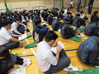 1限目は、3年生全クラスが体育館に集合して、全体での話、面接の練習を行いました。