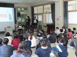 昨年までと趣向を思い切って変更し、大池中学校の3年生の子どもたちが企画・準備をし、タブレットでわかりやすい視覚資料を作成し、自らの言葉で中学校の入学を控える6年生の子どもたちに、わかりやすくて、優しくて、あたたかい言葉と笑顔でガイダンスを実施してくれました。