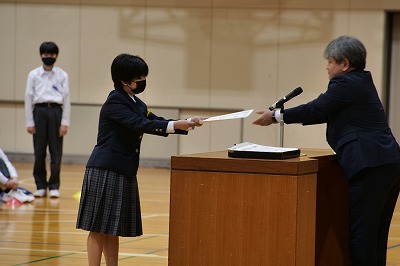今年度最終の授業日。最後は体育館での「表彰伝達式」。今回は、3学期を中心に部活動の取り組みや、作品コンクールでの表彰など顕著な成績を残してくれましたみなさんへの表彰です。写真に紹介しているのは、代表のみなさんにで表彰をわたしている様子です。