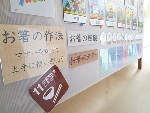 食育関係の掲示板(けいじばん)には、お箸(はし)の作法(さほう)が紹介(しょうかい)されていました。私もお箸の使い方を見直さなければ…と思いながら見ていました。