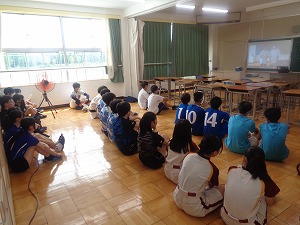 熱中症対策(ねっちゅうしょうたいさく)としてオンライン配信(はいしん)とし、一部生徒以外(いちぶせいといがい)は各教室で画面越(がめんご)しに応援(おうえん)しました。