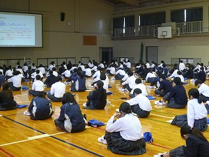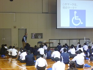 本日6限目、1年生が体育館で『福祉(ふくし)に関する講演会』を行いました。四日市市社会福祉協議会から講師の方2名が来校され、障がい・福祉について丁寧に教えていただきました。ありがとうございました。