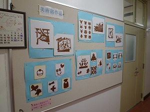 校長室横掲示板(こうちょうしつよこけいじばん)には、美術部員による作品が掲示されます。細(こま)かな図柄(ずがら)など、大変丁寧(たいへんていねい)に作られた作品が並(なら)びました。