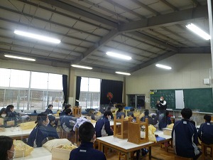 1年生が技術科でブックスタンドを作っています。冷暖房がない技術室ですが、換気もしながら取り組んでいました。