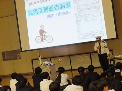 交通安全にかかわる取り組みは、繰り返し、繰り返し行っていくことに「やりすぎ」はありません。自転車に乗っている以上、「軽車両」としての位置づけとなります。今年の4月1日からは、道路交通法での「交通反則通告制度」という通称(青切符)もはじまりました。自転車の交通違反に対しての手続きも変わります。それだけ、自転車運転による交通事故を少しでも無くしていく狙いがあります。だからこそ、自転車通学をはじめたばかりの1年生のこどもたちに対して、とってもわかりやすい口調で、メリハリのある大変聴きやすい言葉を選びながら講義をしていただきました。