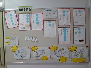 見る人が興味(きょうみ)をもってもらえるように、いろいろな工夫(くふう)がされています。今回の掲示は『カルタ』のような掲示になっています。文字を当てはめるため、クイズのようでもあります。