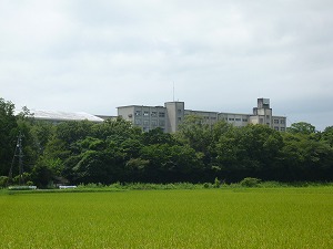 少し遠くからの撮影(さつえい)となりました。この高等学校は市内にあります。(本校区内の一部地域(いちぶちいき)からは近い場所にあると思います。)校舎の北側を写しているので分かりにくいかもしれませんね。難しいかな。