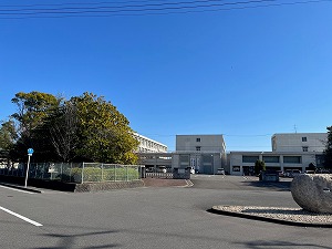 写真の学校は、市外にある県立高等学校です。正門の前に大きな石に校名が刻(きざ)まれていました。(写真は、文字が分からないように加工してあります。)この高等学校の在校生や卒業生ならすぐにわかると思います。