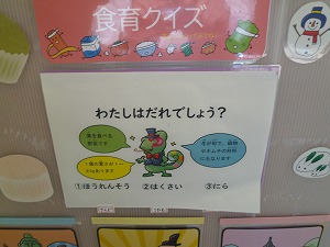 昇降口内(しょうこうぐちない)にあります食育掲示板(しょくいくけいじばん)の『食育クイズ』の内容が新しくなっていました。掲示板前を通りかかったさいには、ぜひ見てみてください。