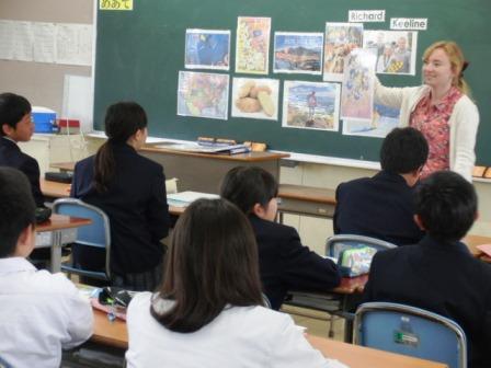 アメリカ人の英語指導員ドリーさんが毎日のように来校し、各クラスの英語の授業に入っています。
