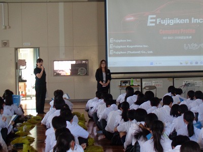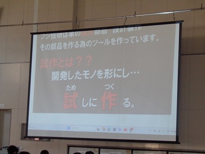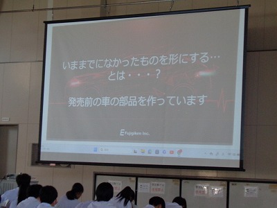 自動車部品の試作・検具・治具をはじめとして、自動車部品を製造する上で必要なあらゆる製品および道具を製作している会社です。3次元システムを生産に関わるすべての工程に活用し、設計から組み立てまでほとんどの工程を内製化したトータルサポート体制をとることみよって、競争力ある会社創りを目指している勢いのある企業です。そのフジ技研様から、取締役常務の鏡谷 有紀 様に企業講演会講師として1時間子どもたち目線でお話をいただきました。