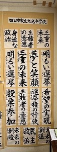 三連休の最終日(さいしゅうび)、市内のいくつかの地区で地域の文化祭が開催されていたようです。校区の県地区や三重地区でも開催されていました。三重地区市民センターには、本校から出展(しゅってん)された人権標語(じんけんひょうご)や書写の展示がありました。