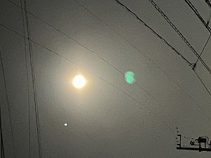 『中秋(ちゅうしゅう)の名月』の次の日の月です。でも、きれいに見えました。(月の下に写る緑色っぽい点は気にしないでください。)月の左やや上に写る星は、木星のようです。違っていたら教えてください。