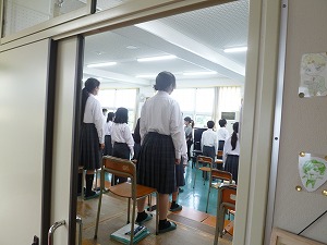4限目、廊下(ろうか)を歩いていると、音楽室から元気な歌声(校歌)が聞こえてきました。見ると、一年生がしっかりと声を出していました。上手でした。