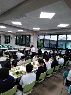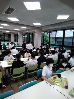 写真は、前半の食事のようすです。まだまだ元気な声が食堂に響いています。