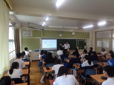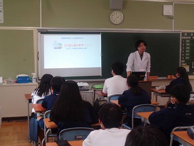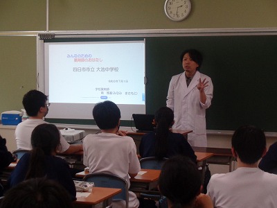 7月1日(月)6限目、学校薬剤師の南雅基さんをお招きして、2年生を対象に、薬物乱用防止教室が行われました。