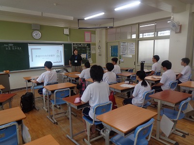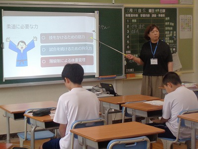 今日は、栄養教諭の井原先生に来ていただき、柔道部のみなさんに「柔道のための栄養学」について話をしていただきました。