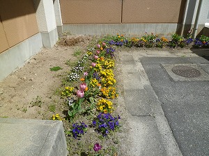学校の花壇(かだん)には、チューリップなど何種類かの花が咲いています。色とりどりの花によって、学校が(少しですが)華(はな)やかな雰囲気(ふんいき)になっています。冬を越(こ)え、春を実感させてくれる光景です。