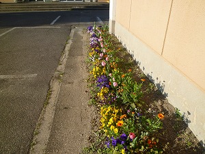 桜もパンジーなどの花も朝日を浴(あ)びてきれいに咲いています。人も寝起(ねお)きには朝日を浴びるといいようです。生活のリズムもくずさないようにしていきましょう。