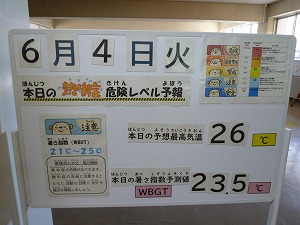 そこで、これから心配なのが熱中症(ねっちゅうしょう)です。生徒昇降口内(せいとしょうこうぐちない)には、その日の気温等(きおんなど)の予測値(よそくち)を示すボードが準備(じゅんび)されています。