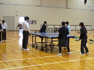 本日午前、1年生が福祉学習の一つとして、SSピンポン(サウンドテーブルテニスともいうようです。卓球台上で、鈴(すず)の入った卓球のボールをラケットで打ち合って(転(ころ)がし合って)得点を競(きそ)うスポーツ)に取り組みました。