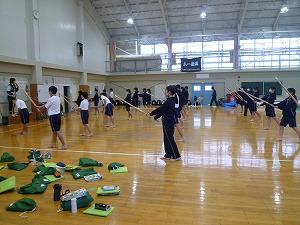 1年生の保健体育科の授業で剣道を行っていました。竹刀(しない)を持つことに慣(な)れていない人も多い状況(じょうきょう)ですが、まっすぐ強く振(ふ)れていたように見えました。