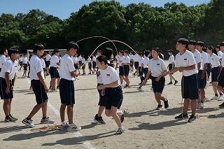 本日の4限目の3年生体育祭に向けての学年練習の様子から。4限目の途中から3年生のみなさんの頑張っている姿を応援させてもらいました!正午に近づき、かなり暑くなってきました。しかし、グラウンドに立つWBGT測定器では、「28度(四日市市観測点では28度以上31度未満であるときは、。熱中症警戒アラートでは、『激しい運動は中止』となっています。そのため、適宜テント下にて休憩(水分補給)を入れながらも、「全員リレー」は4限目には実施せず、3年生学年種目である「まわせ思い出の縄」を実施しました。
