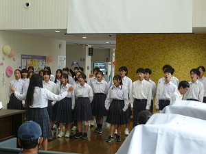 校歌(こうか)も含(ふく)め、3曲(きょく)を披露しました。病院(びょういん)の職員(しょくいん)さんや患者(かんじゃ)さんなどの前で、合唱団のメンバーは緊張(きんちょう)していたようですが、素晴(すば)らしい合唱を会場に響(ひび)かせてくれていました。すてきな経験をさせていただきましたね。四日市消化器病センターの皆さまありがとうございました。
