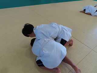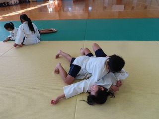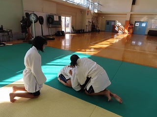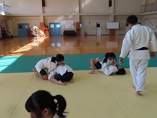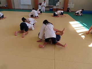 取り組む技能も「受け身」はもちろんこと、「けさ固め」・「横四方固め」などの固め技を2人1組にて取り組んでいきます。ペアも固定せず、クラスの中で誰とでもペアが組めて、誰とでも話し合いながら安全に楽しく取り組めているのがわかります。授業担当の菊岡先生の、丁寧でわかりやすい指導を受け、ペアで協力し教え合いながら、「ペアになって取り組む楽しさ」だけではなく、「技をかける楽しさ」や、「技を外す楽しさ」などを感じながら1時間の授業をあたたかく、楽しいく取り組んでいました。