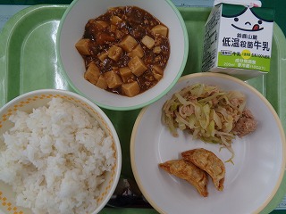 今日の給食のメニューは、米飯、牛乳、マーボー豆腐、あげギョーサ、中華サラダでした。