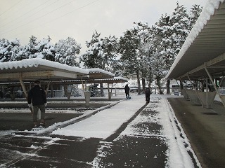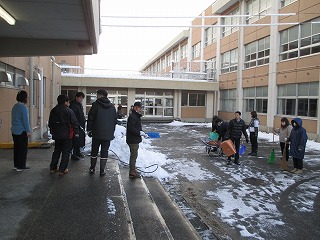 明日、生徒の皆さんが安全(あんぜん)に登校できるよう、先生方が通学路(つうがくろ)を点検し、積もっている雪をどけたり、学校の自転車置き場や歩道の雪かきをしてくれました。