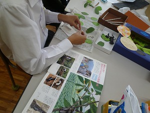 8組では美術科の授業で作品を作っていました。色画用紙などをつかい、昆虫(こんちゅう)や枝葉(えだは)などを作っていました。集中していました。