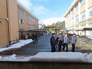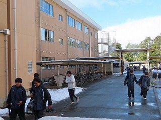 大池中学校の子どもたちの大半が自転車での登下校をしています。昨日から降り続く雪の影響で、多くの通学路では雪が道路に残っていたり、凍結している場所もあったり、特に県小学校周辺の通学路では充分な安全への配慮が必要な場所が目立ちました。また、三重地区でも三重北小学校付近でも、上り下りの多い場所もあるため、自転車通学をする子どもたちの安全面を一番に考え、県小学校と大池中学校では2時間遅れの3限目10時50分から授業を開始しました。3限目からの授業開始に合わせて、大池中学校のほぼすべての教職員で中学校前の歩道の雪かき、自転車置き場周辺の雪かき、職員玄関前の雪かきに時間をかけて丁寧に取り組んでいただきました。