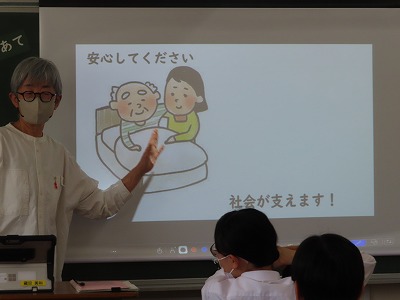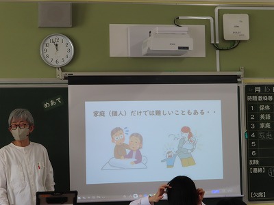 授業での学びでは、家族だけではできないことも意見としてでてきました。そんな時は「共生」として地域とのつながりの大切さ、社会とのつながりによって公的なサービスを受けられることなど、医療や福祉についてもつなげて考えることができました。
