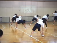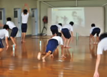体育の授業では、友達どおしが接触する運動を避けるために、個人で行う運動から始めています。