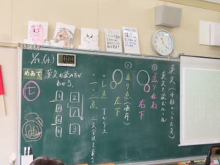 本時の国語授業における単元は「今に生きる言葉」。本時の授業めあては「漢文の読み方がわかる」です。このように本時の国語は「漢文」を取り組みました。「漢文」って、子どもたちのイメージでは、今の時代からはかけ離れているもの、難しい・・・という先入観がある内容でもあります。そんな単元であっても、授業担当者からは「漢文は中国から伝わってきた文章であること。違う国から伝わってきた文章だからこそ、読み方が違うことを理解し、読み方を学ぶ必要があること知る」という大切なポイントをわかりやすく伝えてもらいました。