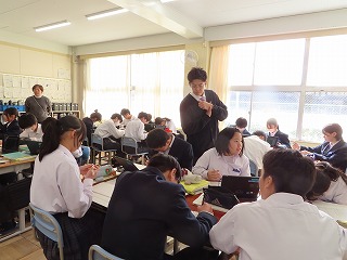 3限目の1年2組での国語授業を、大池中学校の教職員研修委員会が中心となって、日常から教員間で授業を見合うことによっての授業スキルを高めることを目的とした「小グループでの教員同士の研修会提案授業」としても実施させていただきました。