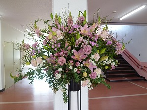 卒業式で飾(かざ)られた花が、来客職員玄関内に置かれています。しばらく、きれいな花が迎えてくれます。