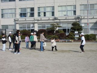 今日の20分休みは、3学期初めてのなかよしタイムでした。今、クラスでは「なわとびタイム」を頑張っていますが、このなかよしタイムでは、たてわり班で大縄跳びをしました。6年生が、「上手!」「あと少し!」の声かけや、縄にひっかかってしまった子には「いいよ!、大丈夫!」と励ましながら、低学年の子が跳びやすいように縄を回していました。