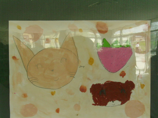 児童玄関前にある、下野小ギャラリーに2年生の絵がかざってありました。その絵はには、ミニーやいちご、くまなどが描かれていました。とてもじょうずでした。 | |