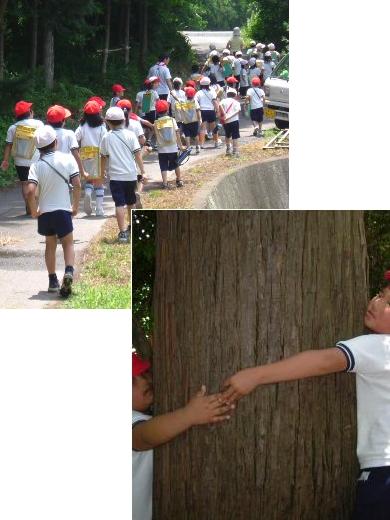 川の中に潜むカエルやカメを発見して歓声をあげたり、自分たちの何倍も太い大木に抱きついてみたりと、子どもたちは楽しみながら自分達の校区について知ることができたようです。
