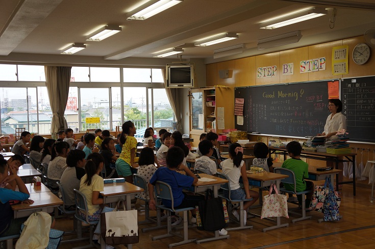教室に戻った子どもたちは、夏休みに取り組んだ作品に名前をつけたり、学級のかかり決めをしたり、目標を考えたりと、それぞれの学級で、落ち着いて活動をしていました。 写真は、4年生のある学級の様子です。発表する子どもをみんながきちんと見て、しっかりと聞けていました。