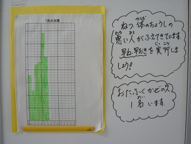 保健室の前には、全校の欠席人数を表したグラフが掲示されています。 写真にあるのが、そのグラフです。 6月の平均欠席人数と比べて、今月は、5人ほど多くなっています。特に、昨日は、34人もの欠席者がいてびっくりしました。ちょっと心配しています。