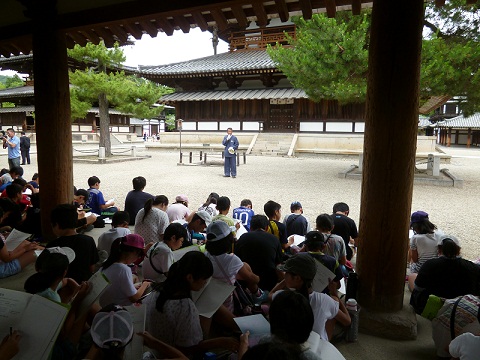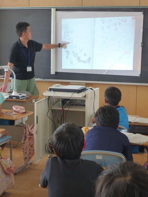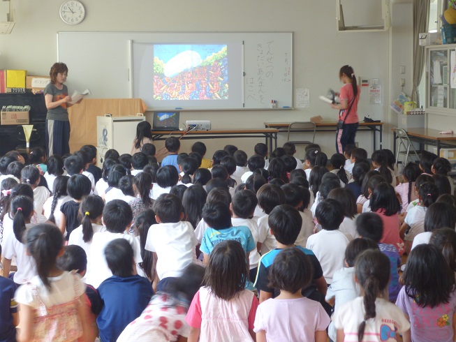 読書週間の取り組みは、各学期に一度ずつ行っています。 保護者の皆様には、「かぞくどくしょのきろく」等でたいへんお世話になります。 お忙しい毎日のことと存じますが、どうぞお子さんと読書のひとときを持っていただけたらと思います。ご無理のないよう、できる限りで結構です。 今日は、教師による読み聞かせを行いました。 多目的教室に、どうでしょうか、100名以上の子どもたちが集まりました。 写真にあるように、2人の教師が、プロジェクターで黒板に映し出された絵本を読み聞かせていました。 題名は「でんせつのきょだいあんまんをはこべ」。リーダーのもとみんなで協力し合って「あんまん」を運ぶ「あり」たち(ありとは思えない・・・)の話でしたが、ユーモアのある楽しいお話でした。 |