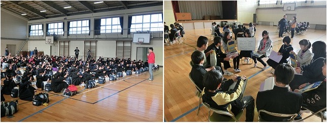 12月5日(金)5・6限目、朝明中学校区人権フォーラムが開催されました。これは、小学校6年生と中学校1年生の児童・生徒が、ともに人権について学び、考える会です。例年は、一部代表の子ども達だけで行っていましたが、本年度は新しい試みとして、対象の全児童・生徒が参加することとなりました。この日、朝明中学校の1年生の生徒全員に、出身校である八郷小と大矢知興譲小へ分かれて訪問してもらいました。本校では、まずはじめに体育館で全体会を行いました。この会の趣旨等の説明のあと、アイスブレイキング(緊張ほぐし)のゲーム。そのあとは、小・中混合で11人程度のグループを16つくり、5つの会場に分かれました。グループごとに丸くなって椅子にすわり、中学生のリーダーの司会で、3つのテーマについて話し合いを行いました。はじめはちょっと緊張気味でしたが、中学生のリードで、活発な話し合いがみられるグループも出てきました。今後も、普段なかなか持てないこんな機会も利用しながら、人権についての理解を深め、小中の連携を図っていきたいと思います。 |